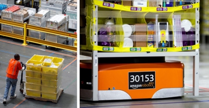 원본보기미국 인터넷 쇼핑업체 아마존이 배송 시간을 줄이기 위해 기존에 사람이 직접 상품을 옮기고 분류하는 일(왼쪽)을 최소한으로 줄이고 자체 로봇 기술을 이용한 자동 물류(오른쪽)의 비중을 빠르게 끌어올리고 있다. 이미 미국 전역 105개의 물류창고에서 5만 대의 로봇이 사람이 하던 단순 업무를 대체해 나가고 있다. /AP 연합뉴스·아마존
