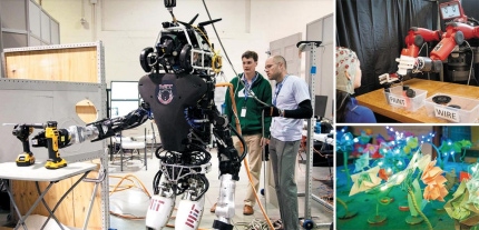 왼쪽 사진은 MIT 컴퓨터과학·인공지능연구소 과학자들이 인간형 로봇 ‘아틀라스‘에 공구를 사용하는 방법을 가르치는 모습. 오른쪽 위 사진은 뇌파를 감지해 생각만으로 로봇 박스터를 조종하는 모습. 오른쪽 아래 사진은 빛을 내며 움직이는 AI 식물. AI는 인문·사회·경제·예술 등 안 보이는 세계에서도 자신의 영향력을 확대하고 있다. /미 매사추세츠공대